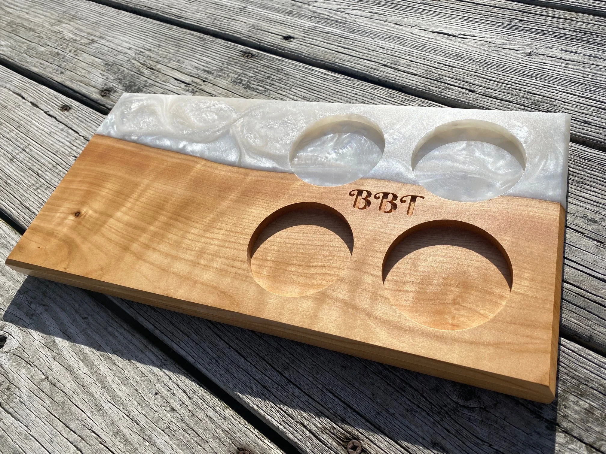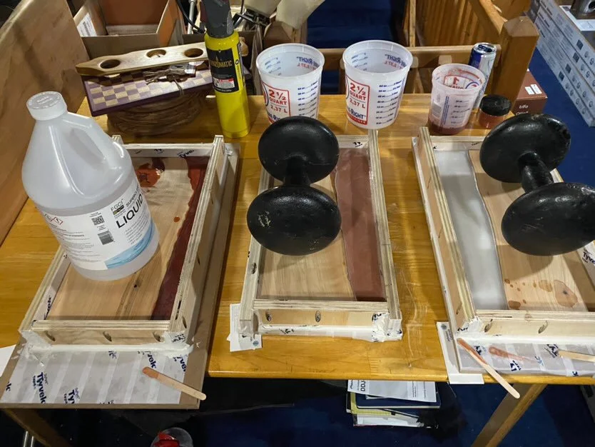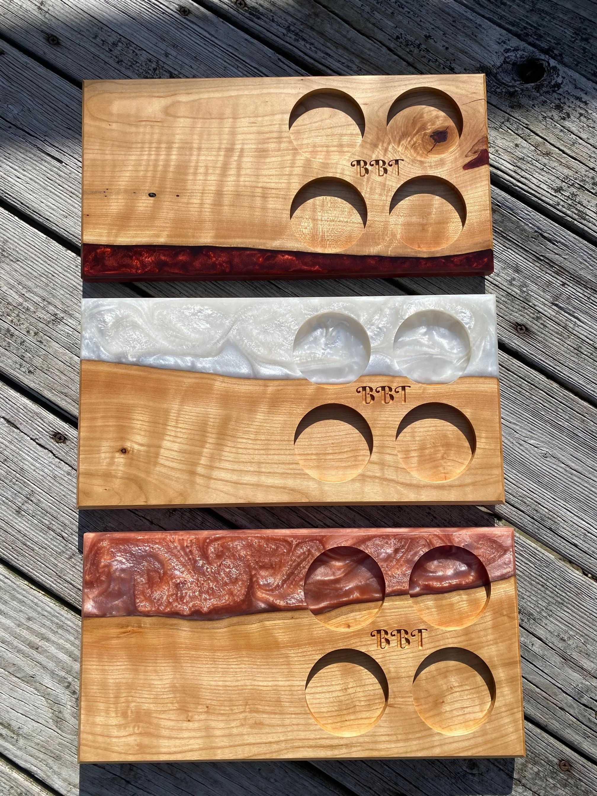 Using a piece of plywood, I mocked up a sample of what her vision would be “in real life”. Once the design was approved, we talked about budget. Alicia established what she was looking to spend per board, and I was able to give her a few options. We spoke about her original design and how many boards she could fit within the allotted monies. I gave her an option incorporating epoxy that would still fit within her budget. Alicia only wanted 3 boards, and the photos of epoxy boards I had made previously helped her in choosing.